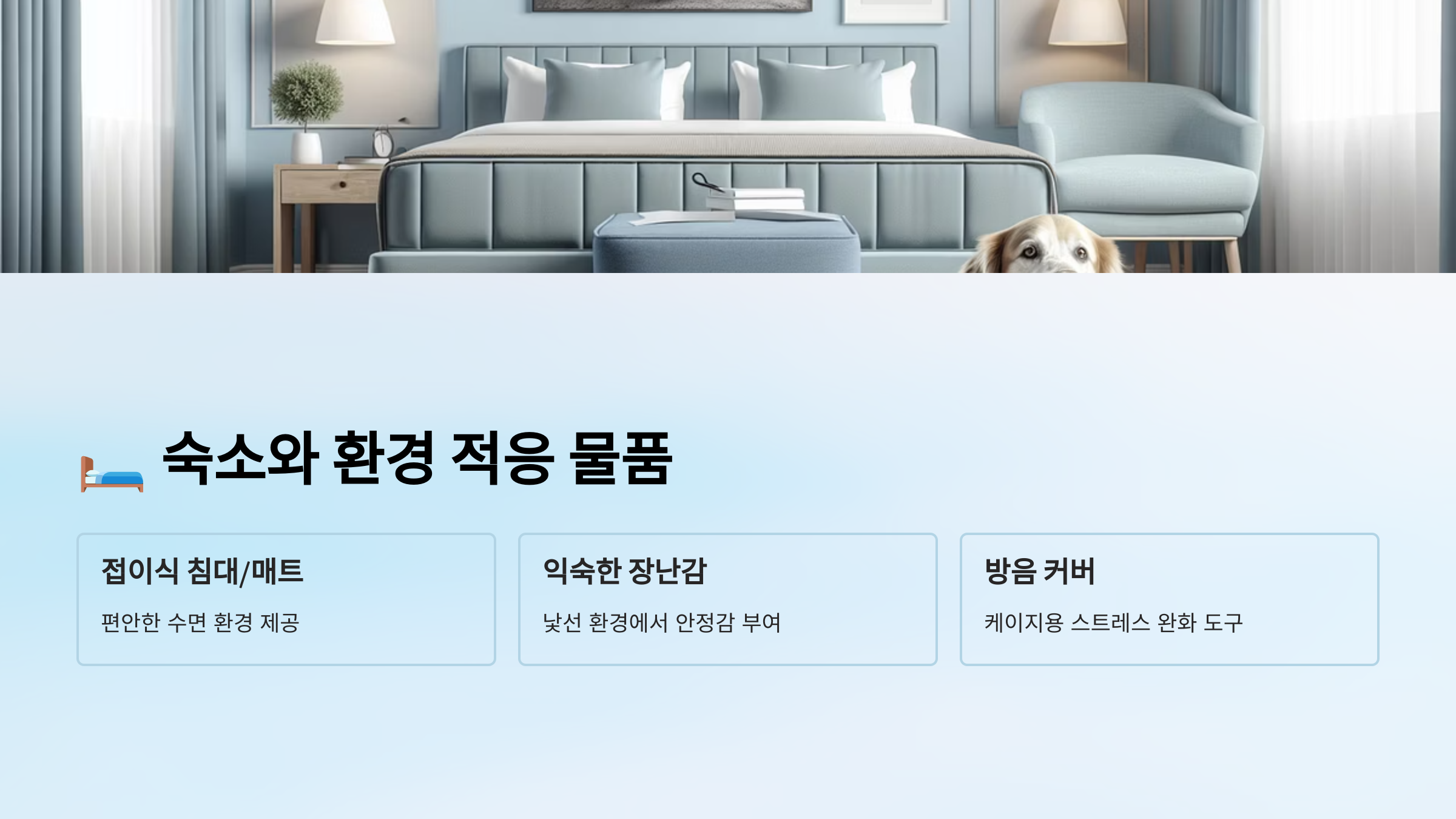 | 담요/방석 | 집 냄새가 배어 있어 안정감 제공 |