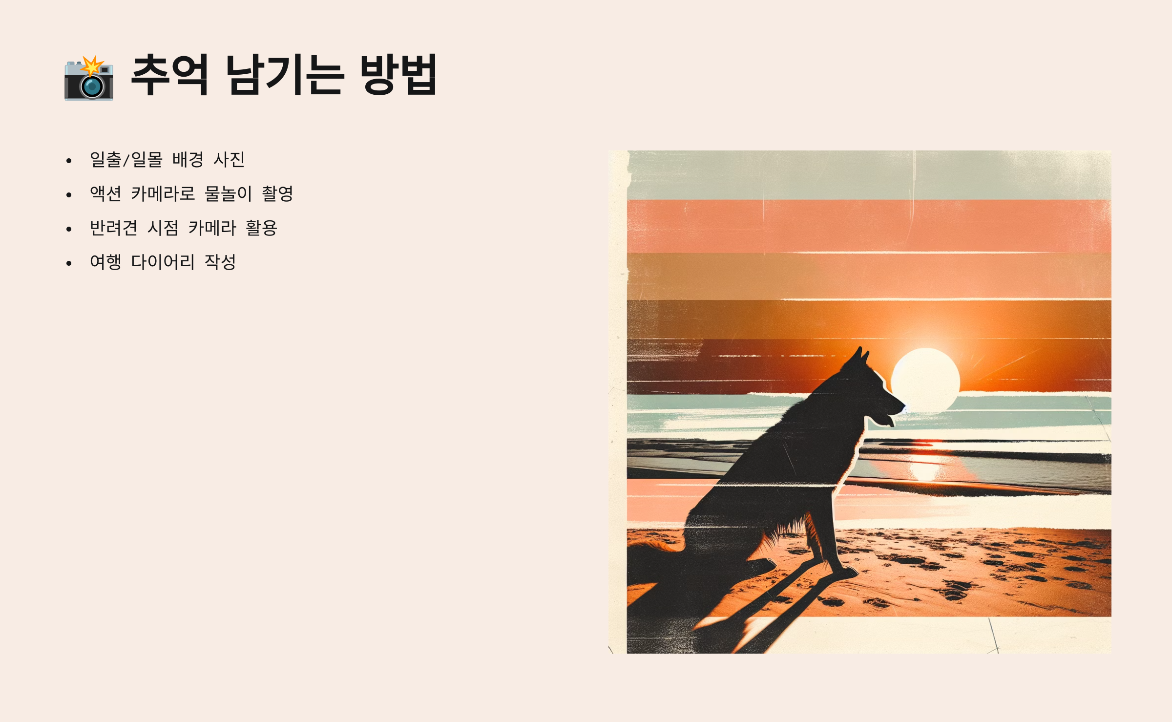 여행의 가장 큰 재미 중 하나는 '사진'이에요! 반려견과 함께한 특별한 순간을 사진이나 영상으로 남겨보세요. 강아지가 해변을 뛰어다니거나, 잔디밭에서 뒹구는 모습은 평생 간직할 소중한 추억이 돼요. 🐶✨