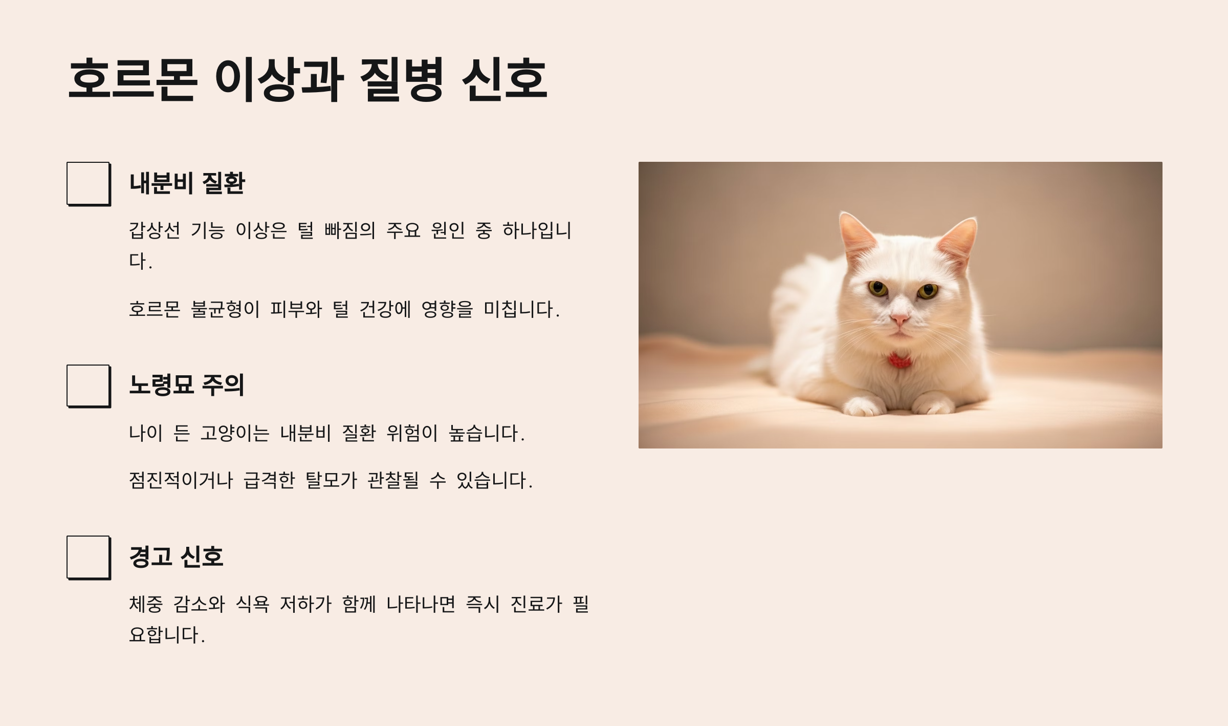 고양이의 털 빠짐이 일정한 패턴이나 부위 중심으로 지속된다면, 호르몬 불균형을 의심해봐야 해요. 특히 갑상샘 이상, 쿠싱증후군, 당뇨, 신장질환 등은 피모 변화로 나타나는 경우가 많답니다.