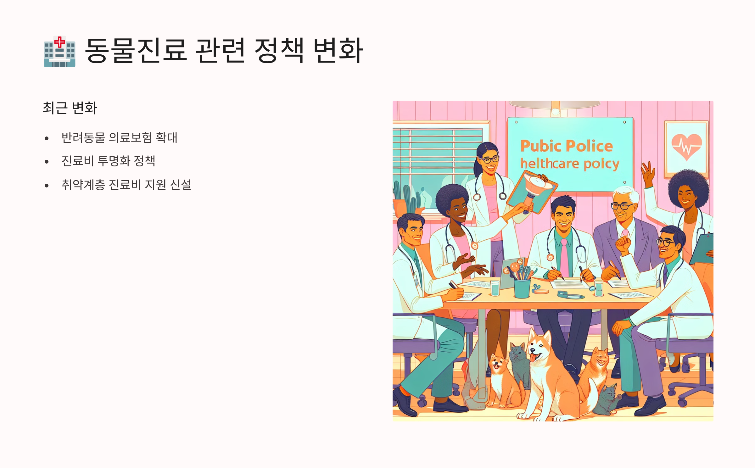 반려동물 양육 가구가 급증하면서, 동물진료를 둘러싼 제도도 빠르게 바뀌고 있어요. 특히 ‘동물도 가족이다’라는 인식이 확산되면서, 동물병원 진료를 생활필수 의료로 보자는 사회적 분위기가 강해지고 있어요.