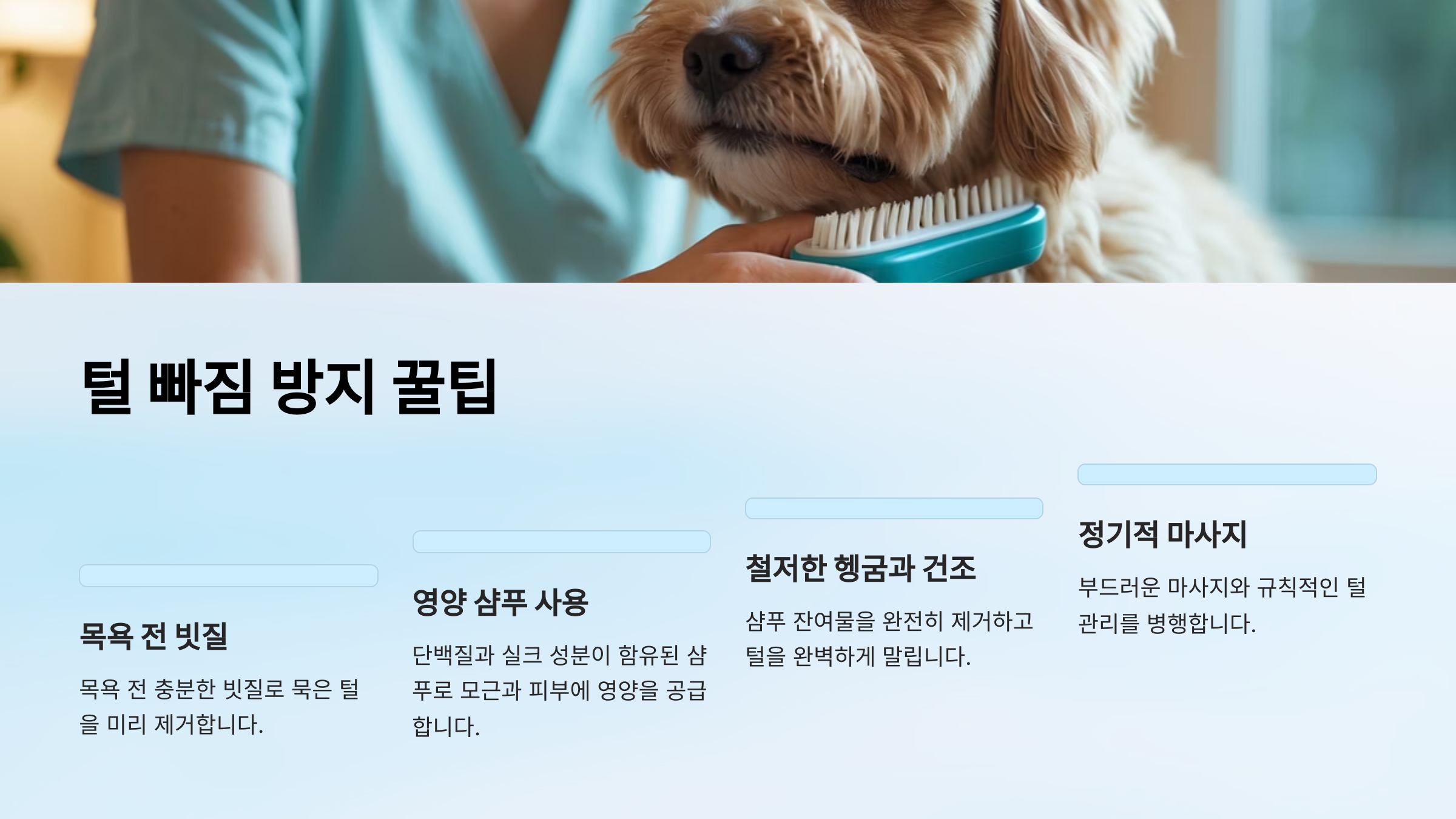 | 빗질 | 죽은 털 제거, 혈액순환 개선 |