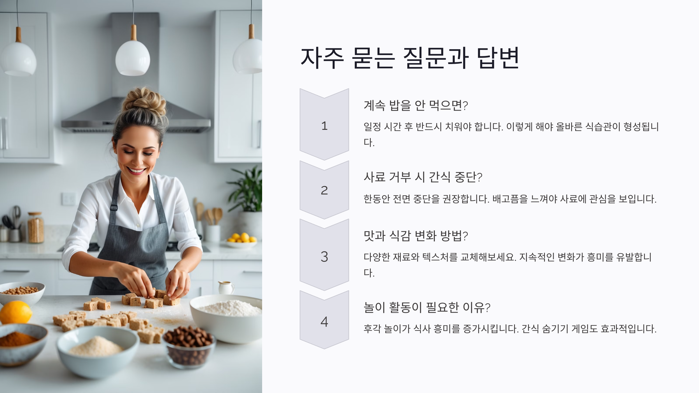 A2. 간식 시간을 정하고, 식사 후 보상으로만 주는 습관을 들이면 좋아요. 식사 전엔 간식을 피하세요.