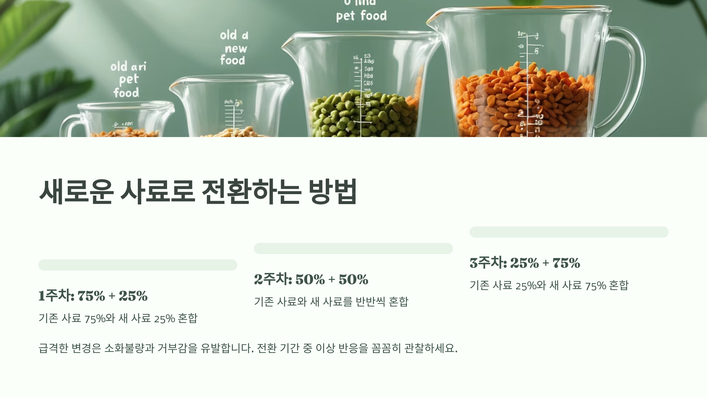 전환 1~2일 차에는 기존 사료 75%, 새 사료 25%로 시작하고, 이후 매일 25%씩 비율을 늘려가며 새 사료를 늘려줘야 해요. 이렇게 하면 반려동물의 장이 새로운 성분에 적응할 수 있는 시간을 벌 수 있어요. 이것만 지켜도 문제의 90%는 예방할 수 있어요.