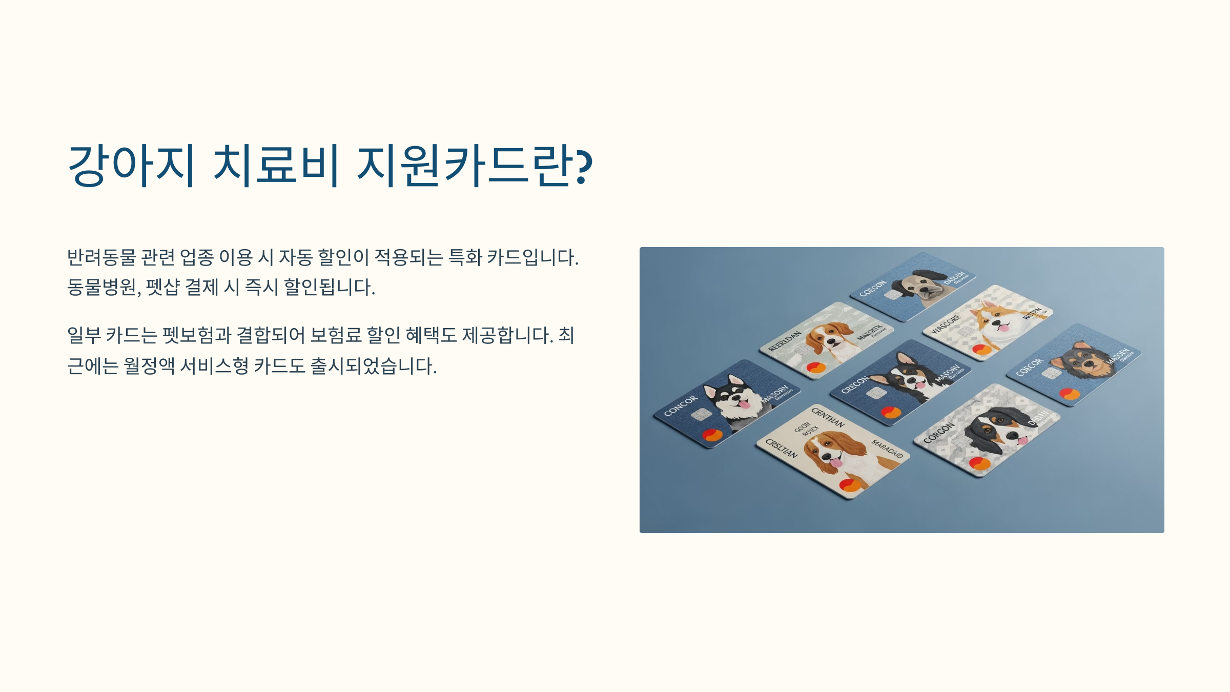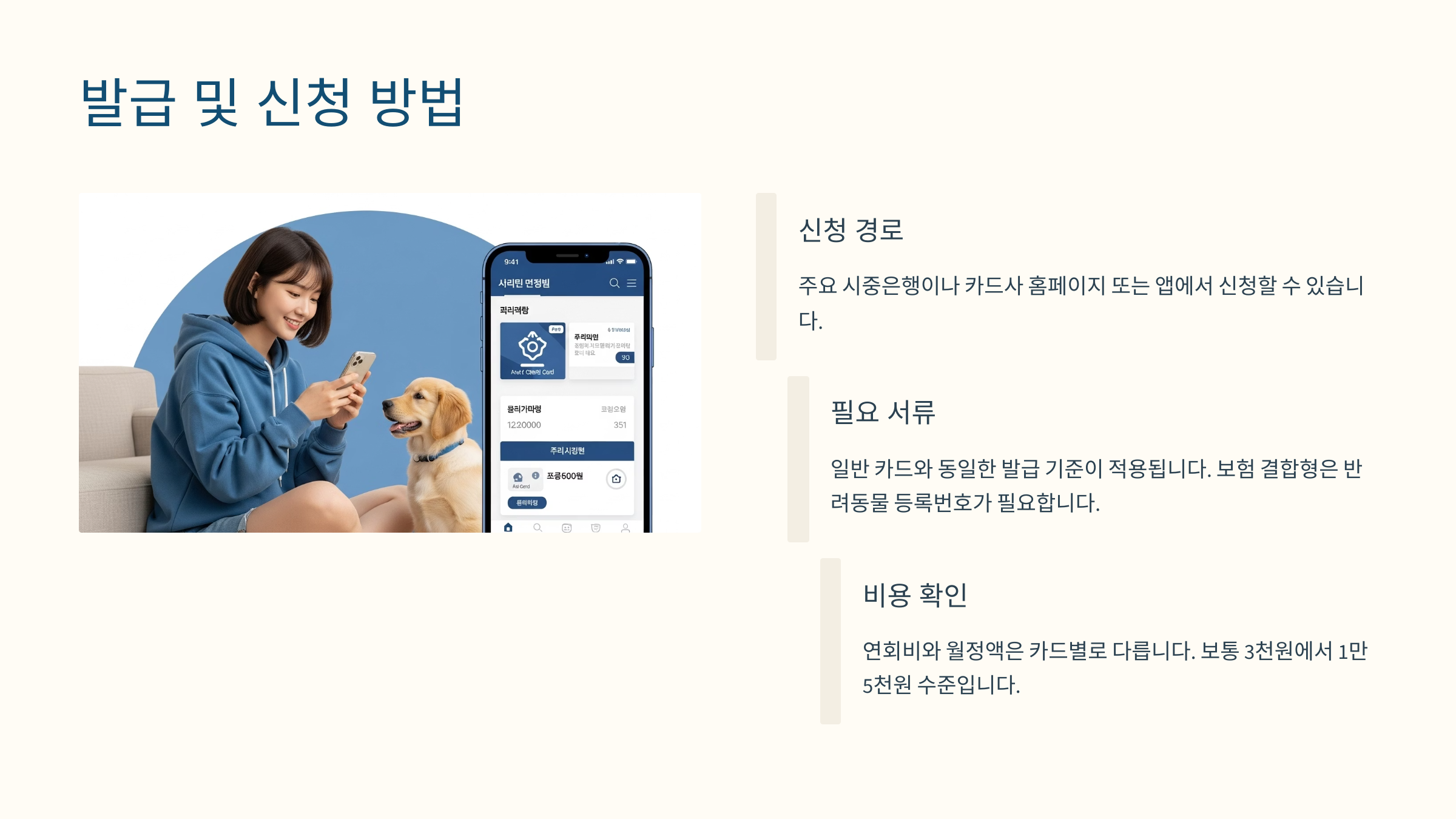 즉, 반려견과 함께 사는 사람들에게 실질적인 치료비 부담을 덜어주는 도구라고 볼 수 있어요. 실제로 KB국민카드, 삼성카드, 현대카드 등에서 다양한 펫카드를 내놓고 있어요. 🐶